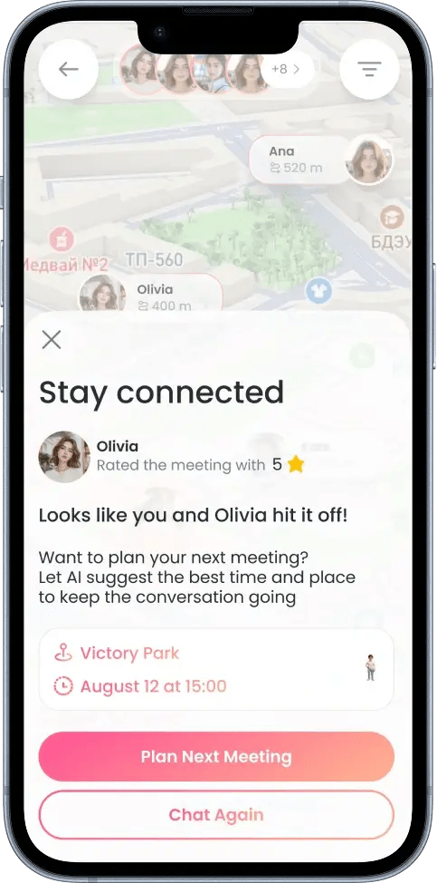 – Планируемые встречи: задаёте удобное время и место на карте, AI предложит оптимальные варианты, а вы подтвердите дату.